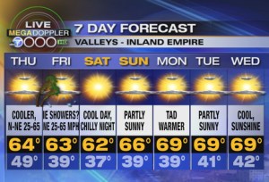 What makes me laugh this time are trees that have fallen onto LA & OC freeways. Who plants trees next to the freeway? Caltrans and they have begun to plant trees out our way along the 210 freeway and 15 freeway, heck why not give the winds something else to use to crush cars and people, our freeways don’t have enough problems lets add fallen trees to the list. The weather is going to get worse before it gets better we can always guarantee we are going to deal with winds for 8-10 hours past the weather guesser projections, and here are those: