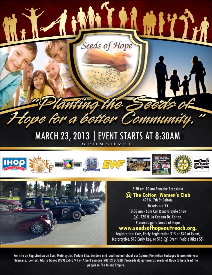 We are looking for vendors all types of car clubs or just car , looking for all styles of motorcycles, peddle bikes, peddle cars or if you are just an enthusiast of any of these and want to show what you have at this fundraiser for Seeds of Hope www.seedsofhopeoutreach.org that helps everyone one with food, some infant needs, anger management, parenting classes and more in The Inland Empire. To find out more about participating at this event please contact Albert 909-213-7288 or Gloria Gaona 909-856-0741. Find out about our special Sponsorship Packages, Gold, Silver & Bronz. Thank You for your support.