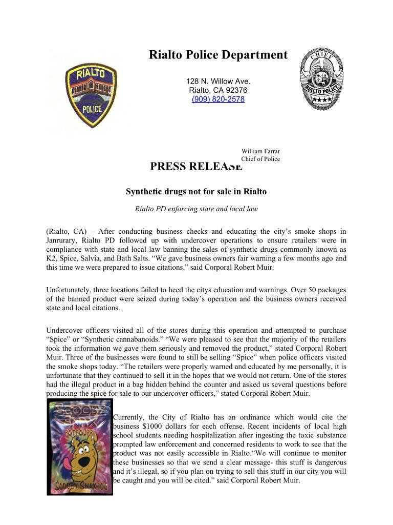 We have received reports that Rialto Police Department SCAT team conducted a sweep of local businesses known to sell synthetic drugs like SPICE & BATHSALTS.