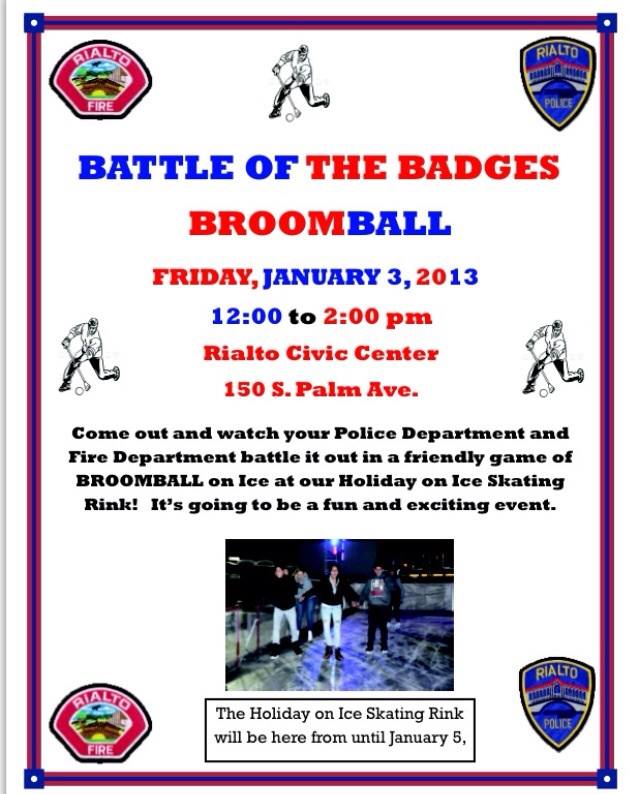 Today the residents of the city of Rialto were treated to a friendly game of Broomball. It was a Battle of the Badges that will go down in history. Rialto Fire Department was keeping the police department at bay staying one point ahead with aggressive offensive play and good ice. After the second period was over the heat of the 80 degree day finally made the ice the great equalizer. Portions of the ice became super slick and both teams players found the ice difficult to maneuver on.