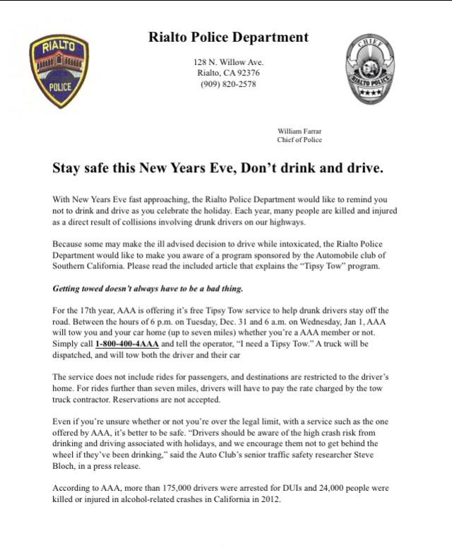 Also Rialto Police Department has put out a flyer on the Tipsy Tow program put on by AAA. Simply call 1-800-400-4AAA and get a free Tow to your LOCAL Home.