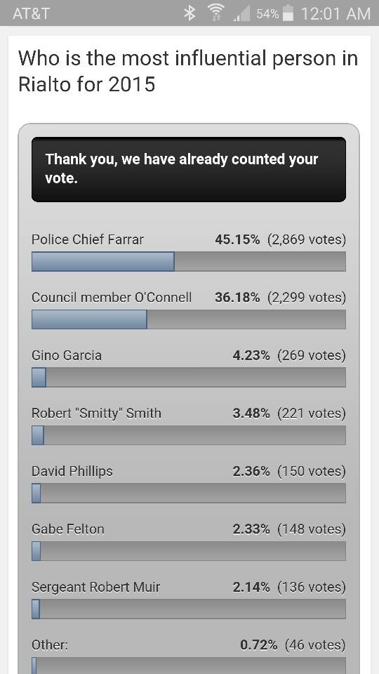 Were putting together a 2015 re-cap for the city of Rialto and were looking for your help in choosing the top three people that made life here in Rialto a pleasant experience. So often we get accused of pushing our own agenda and that would be fine if people knew our only agenda is to inform the people of the city of Rialto and the outlying cities that surround us.