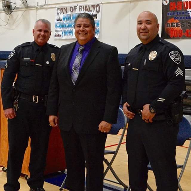 Rialto Police Chief Randy Deanda had the honor of promoting two more officers that have been promoted to the ranks of Cpl and Sgt. Both men have strong family ties to Rialto and the surrounding region. As this writter comes from a family of law enforcement professionals we know the stress a family can undergo having a father, husband, mother or wife woring in Public Safety. These two men take the the day in and day out work of a Public Safety officer to another level by taking on assignments in Traffic, Gangs and Narcotics assignments. These men also have strong wives and families that support the work they do in our community without support the work these our public safety officer do could eat them up from the inside out.