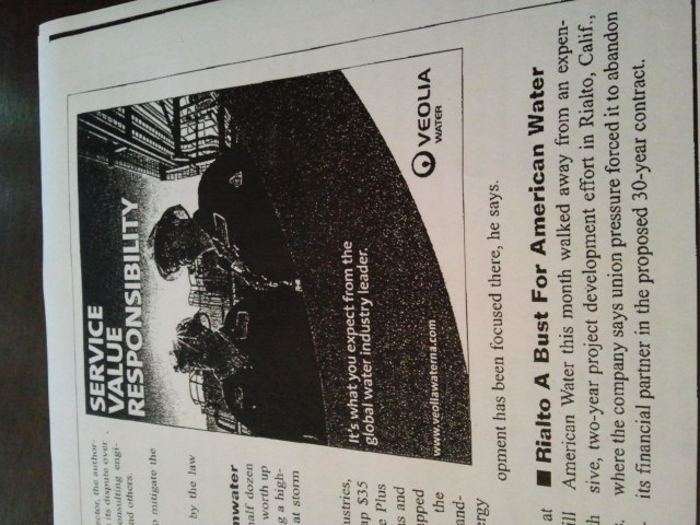 Now we were sent an interesting piece of news. The article below is about the failure of American Water to secure the contract with the City of Rialto. I find it interesting that in the press release they (RWS) claim they decided to sever ties with American Water, but here it looks like American Water was the one cutting the ties. Insiders have told me that the cities decision to ignore the residents desire to put the outsourcing issue to a vote in November gave American Water an uneasy feeling about moving forward. The city attorney’s bad advice to the council now looks like a failed political move.
