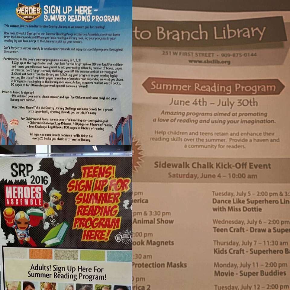 Summer Reading Program Kick-off Party is this Saturday at 10:00 am. Friends of the Rialto Library will have a face painter give us Superhero mask, sidewalk chalk and popcorn. Come and join us to sign up for a great SRP season. They want you! BRING WATER it is going to be hot!