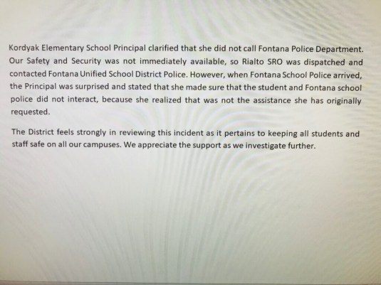 Rialto Police Lt Paul Stella said that Rialto PD Although one of our officers did respond to the call yesterday at Kordyak Elementary, our officer never made contact with mom and student. I encourage you to reach out to the Fontana Unified School Police Department who was also on scene and may have further information regarding this call. When pressed Lt Stella would not say from where the call for service originated from “We will not be releasing the Reporting Person’s information and any request via the call for this information under the Public Records Act would have that information redacted.” Rialto Police Lt. Stella is refusing to release the name of the officer or any other details in regards to this incident.