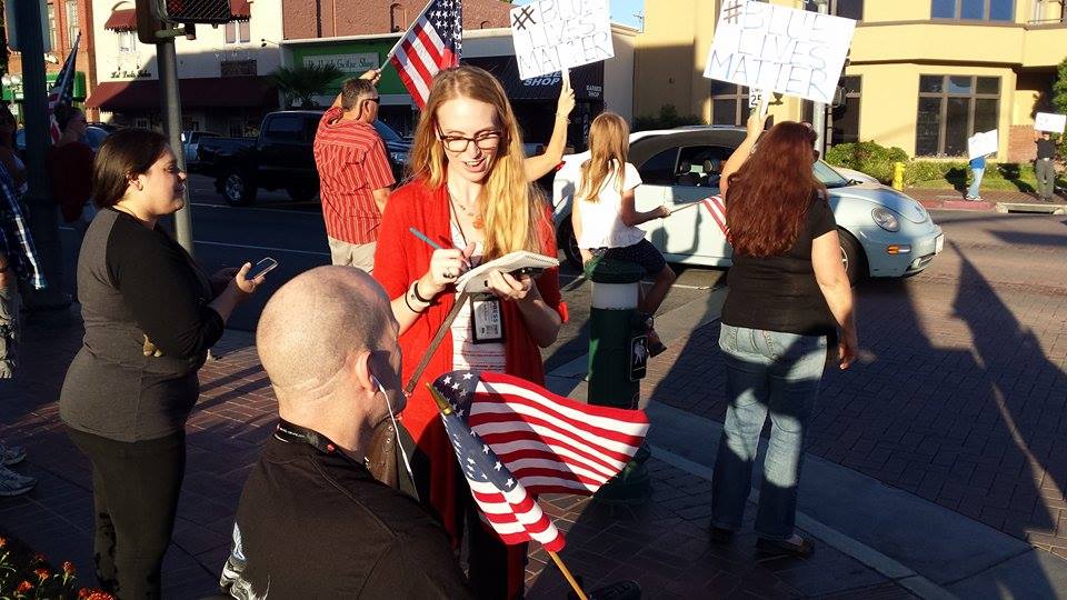 “Normally when I see a police officer I walk up to him or her to thank them for their service,” she said while holding a “Blue Lives Matter” sign and holding an American flag.