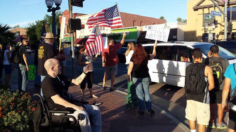 “For me this is not about politics! As a former Police Sergeant I attended this function as a private citizen supporting Law Enforcement. They are the ones who put on a uniform every day to protect us – America. They do so knowing full well that they may not be returning home that night. When officers are assassinated in the street their children are forced to attend their funerals, I say enough is enough. This is not about liberals or Conservatives or Democrats and Republicans it’s about the men and women who put on that uniform. Are there problems within dome police departments? The answer is yes, as there is within any organization. Things have to change within law enforcement, within our society, within the family structure and within our government. The concern I have is that we have reached a point where officers are being assassinated in the street and not enough people are getting involved. The next step is the complete breakdown of social rules, which will ultimately lead to the suffering of socirty. Don’t you remember 9/11 when both the Police & Fire ran toward the Twin Towers? When they did so regardless of the safety for their own lives? How did we get to the point of killing officers just for wearing a uniform – 14 years later? That is why I was out there that night waving an American Flag. Not to support any political group or cause. I was there proudly to support the men & women of Law Enforcement.”