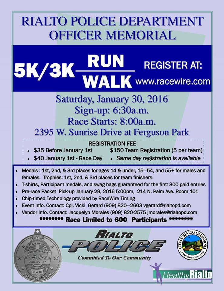 Location: Ferguson Park, 2395 Sunrise Drive, Rialto, CA Sign-up begins at 6:30 a.m. Race starts at 8:00 a.m. Follow the link to register.