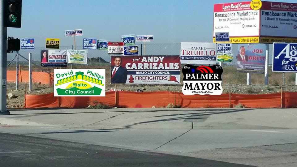 Mayor Robertson is not the only culprit others like Assembly Woman Cheryl Brown have attached signs to every wooden surface that possibly exists in Rialto. What is worse is that her signs are attached to areas where the land is for sale or lease and is full of graffiti leaving this writer to wonder if she cares what her assembly district looks like? Others Like Rafael Trujillo and Pete Aguilar have been accused of removing other signs and placing their signs where they removed another sign.