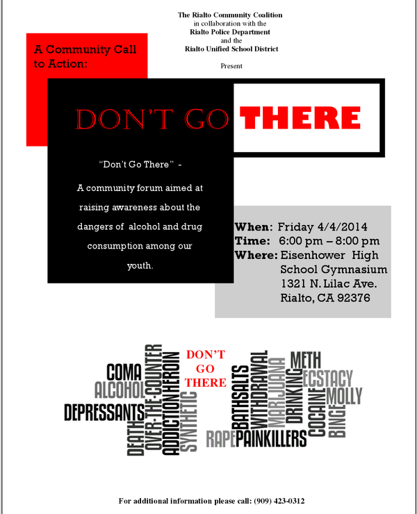 Since this is the beginning of the school year, and the Rialto Unified School District has expressed interest in collaborating with us, we need to take this opportunity to begin planning our next community action project in Rialto. You are needed now, more than ever, to emphasize the dangers and consequences of underage drinking and drug use to students (and adults) in Rialto… By the way, a couple of staff members from the Department of Behavioral Health will be attending our meeting to discuss effective policies, data collection, and media strategies concerning perceived norms and youth access to alcohol and other drugs. Our input and collective work will help in the development of a five-year strategic plan for “Environmental Prevention” in San Bernardino County.